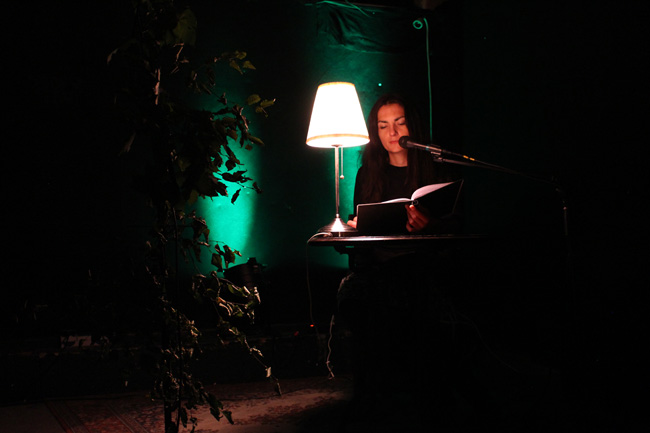 Die Kölner Autorin liest heute Abend Auszüge aus ihrem Roman "Wölfe vor der Stadt", und der Gründer von GRIFT trägt einen Reigen von Liedern vor, von denen einige ebenfalls ein wildes Weben und Leben außerhalb des Urbanen thematisieren. Begegnet sind sich die beiden Kreativen schon des Öfteren auf Konzertabenden, und so wie sich z.B. Matt MacNerney (Hexvessel) für Veranstaltungen ausspricht, auf denen sich Musik mit anderen Künsten verbindet, so kann auch Erik dieser Kombination etwas abgewinnen – hier und heute vor allem Atmosphärisches, wie er nach der rund halbstündigen Lesung erklärt.