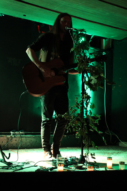 Wenn Erik Gärdefors seine Lieder spielt, dann entzündet er dazu Rauchwerk, und auch heute Abend ist das so. Tonaufnahmen von Wald- und Wiesengeräuschen und insbesondere von Vögeln hat der Schwede für sein neues Album "Dolt Land" selbst in die Hand genommen. Auf Solo-Konzerten spielt er sie von Band ab, während er seine Lieder auf der von ihm zuweilen auch perkussiv genutzten Gitarre intoniert, und sein kräftiger Gesang von Jahr zu Jahr eine immer größere Bandbreite abdeckt. Mittlerweile sei diese Form der Darbietung die von ihm favorisierte, gibt der Schwede zu Protokoll, und wer weiß – vielleicht gehören die Tage von GRIFT als Black-Metal-Band vorerst der Vergangenheit an…?